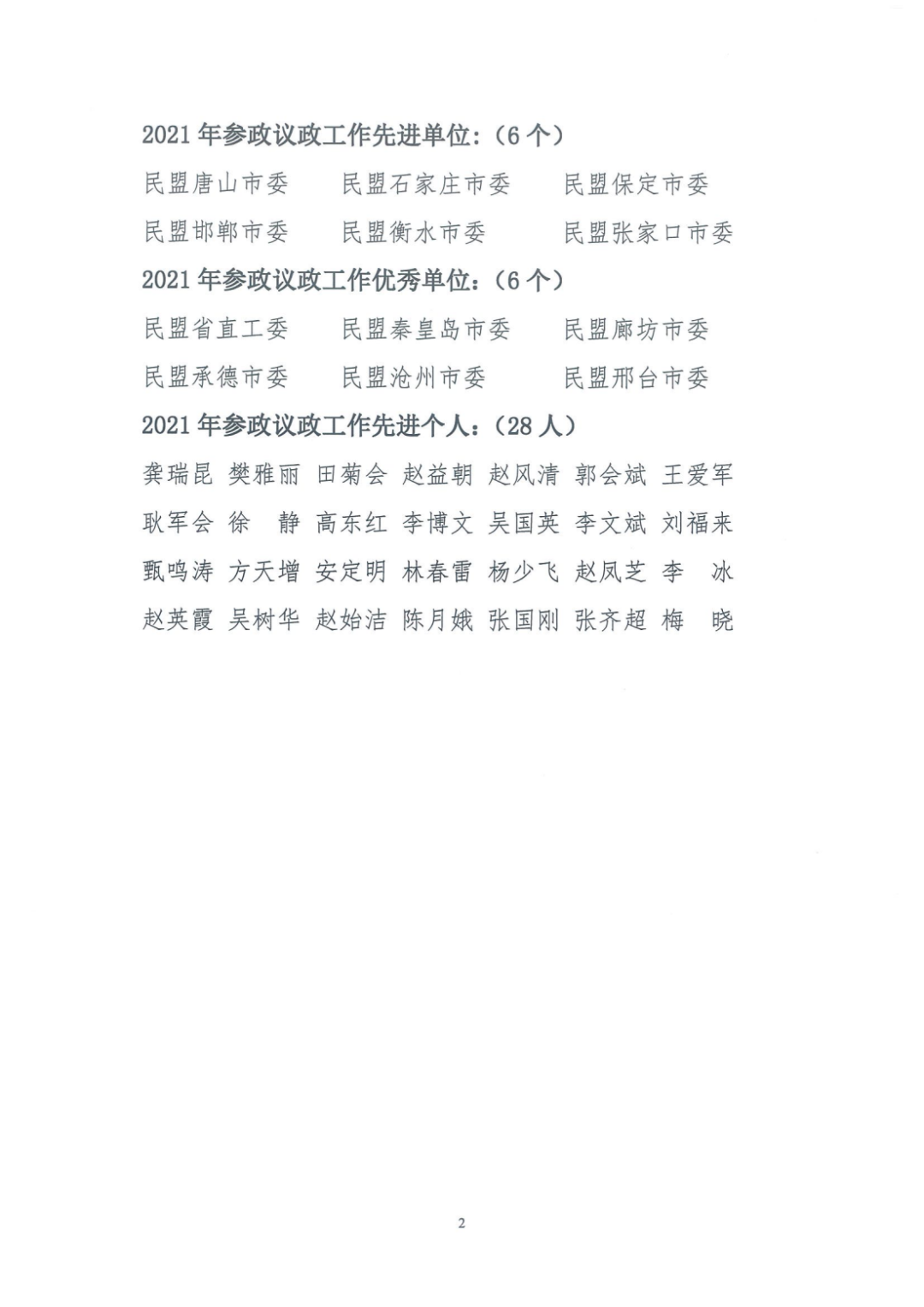 2022年5月18日,民盟省委反饋:民盟張家口市委榮獲民盟河北省委2021年參政議政工作先進(jìn)單位、反映社情民意信息先進(jìn)集體二等獎(jiǎng);安定明榮獲參政議政工作先進(jìn)個(gè)人,師曉紅、張旭鳳榮獲反映社情民意信息先進(jìn)個(gè)人。